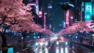 夜の桜並木の大通り