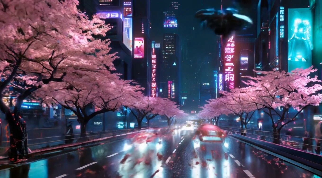 夜の桜並木の大通り